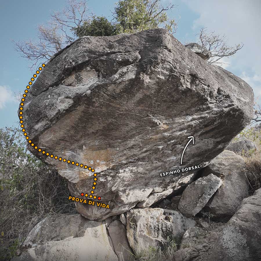 Linha que percorre a parte esquerda e mais alta do bloco. Saída de pé a partir de uma invertida proeminente mais um reglete bom de esquerda na aresta da proa. Recomenda-se um pé baixo, ruim/chapado, próximo ao "jorge" (que não é usado). O início é moderno e mais atlético, até conquistar um batentão na esquerda, de onde sobe uma diretíssima reto acima. O final é mais encaixado ou posicional. O crux, talvez, seja sair da "bolota" de esquerda acima do batentão e ganhar um abaulado antes de um balcão bom lá em cima. Boulder digno da classificação "king line".